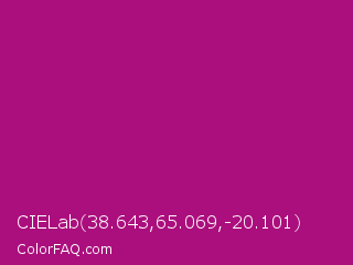 CIELab 38.643,65.069,-20.101 Color is a normal magenta color and the nearest color is Flirt #a2006d. Hex code #ab0e7d and RGB value is rgb(171,14,125). In RGB color space, this color is composed of 67% red, 5% green, 49% blue, In CMYK color space, this color is composed of 0% cyan, 92% magenta, 27% yellow , 33% black , In HSL color space, this color has a hue angle of 318° , 85% saturation and 36% lightness.