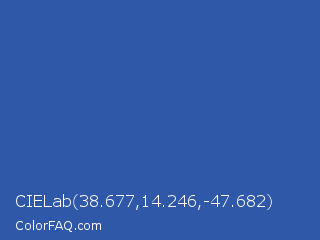 CIELab 38.677,14.246,-47.682 Color is a normal blue color and the nearest color is Azure #315ba1. Hex code #3058a9 and RGB value is rgb(48,88,169). In RGB color space, this color is composed of 19% red, 35% green, 66% blue, In CMYK color space, this color is composed of 72% cyan, 48% magenta, 0% yellow , 34% black , In HSL color space, this color has a hue angle of 220° , 56% saturation and 43% lightness.