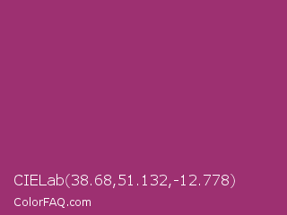 CIELab 38.68,51.132,-12.778 Color is a normal magenta color and the nearest color is Amaranth Deep Purple #9f2b68. Hex code #9d3071 and RGB value is rgb(157,48,113). In RGB color space, this color is composed of 62% red, 19% green, 44% blue, In CMYK color space, this color is composed of 0% cyan, 69% magenta, 28% yellow , 38% black , In HSL color space, this color has a hue angle of 324° , 53% saturation and 40% lightness.