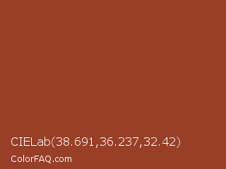 CIELab 38.691,36.237,32.42 Color is a normal red color and the nearest color is Cumin #924321. Hex code #993f28 and RGB value is rgb(153,63,40). In RGB color space, this color is composed of 60% red, 25% green, 16% blue, In CMYK color space, this color is composed of 0% cyan, 59% magenta, 74% yellow , 40% black , In HSL color space, this color has a hue angle of 12° , 59% saturation and 38% lightness.