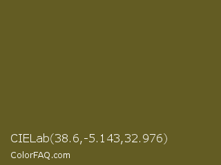 CIELab 38.6,-5.143,32.976 Color is a dark yellow color and the nearest color is Antique Bronze #665d1e. Hex code #635c23 and RGB value is rgb(99,92,35). In RGB color space, this color is composed of 39% red, 36% green, 14% blue, In CMYK color space, this color is composed of 0% cyan, 7% magenta, 65% yellow , 61% black , In HSL color space, this color has a hue angle of 53° , 48% saturation and 26% lightness.