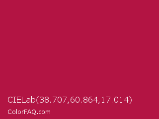 CIELab 38.707,60.864,17.014 Color is a normal rose color and the nearest color is French Wine #ac1e44. Hex code #b31443 and RGB value is rgb(179,20,67). In RGB color space, this color is composed of 70% red, 8% green, 26% blue, In CMYK color space, this color is composed of 0% cyan, 89% magenta, 63% yellow , 30% black , In HSL color space, this color has a hue angle of 342° , 80% saturation and 39% lightness.