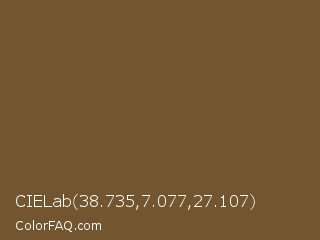 CIELab 38.735,7.077,27.107 Color is a normal orange color and the nearest color is Shingle Fawn #6b4e31. Hex code #73562f and RGB value is rgb(115,86,47). In RGB color space, this color is composed of 45% red, 34% green, 18% blue, In CMYK color space, this color is composed of 0% cyan, 25% magenta, 59% yellow , 55% black , In HSL color space, this color has a hue angle of 34° , 42% saturation and 32% lightness.