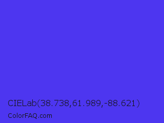 CIELab 38.738,61.989,-88.621 Color is a normal indigo color and the nearest color is Han Purple #5218fa. Hex code #4d36f0 and RGB value is rgb(77,54,240). In RGB color space, this color is composed of 30% red, 21% green, 94% blue, In CMYK color space, this color is composed of 68% cyan, 78% magenta, 0% yellow , 6% black , In HSL color space, this color has a hue angle of 247° , 86% saturation and 58% lightness.
