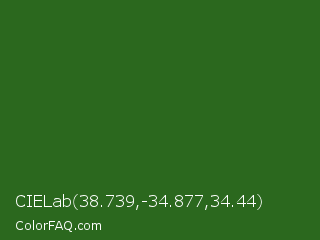 CIELab 38.739,-34.877,34.44 Color is a dark green color and the nearest color is Dell #396413. Hex code #2b681e and RGB value is rgb(43,104,30). In RGB color space, this color is composed of 17% red, 41% green, 12% blue, In CMYK color space, this color is composed of 59% cyan, 0% magenta, 71% yellow , 59% black , In HSL color space, this color has a hue angle of 109° , 55% saturation and 26% lightness.