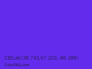 CIELab 38.743,67.203,-86.288 Color is a normal indigo color and the nearest color is Han Purple #5218fa. Hex code #632cec and RGB value is rgb(99,44,236). In RGB color space, this color is composed of 39% red, 17% green, 93% blue, In CMYK color space, this color is composed of 58% cyan, 81% magenta, 0% yellow , 7% black , In HSL color space, this color has a hue angle of 257° , 83% saturation and 55% lightness.