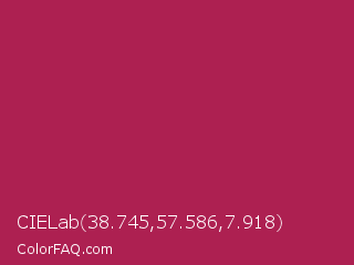 CIELab 38.745,57.586,7.918 Color is a normal rose color and the nearest color is Amaranth Purple #ab274f. Hex code #ad2051 and RGB value is rgb(173,32,81). In RGB color space, this color is composed of 68% red, 13% green, 32% blue, In CMYK color space, this color is composed of 0% cyan, 82% magenta, 53% yellow , 32% black , In HSL color space, this color has a hue angle of 339° , 69% saturation and 40% lightness.