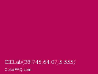 CIELab 38.745,64.07,5.555 Color is a normal rose color and the nearest color is Lipstick #ab0563. Hex code #b40755 and RGB value is rgb(180,7,85). In RGB color space, this color is composed of 71% red, 3% green, 33% blue, In CMYK color space, this color is composed of 0% cyan, 96% magenta, 53% yellow , 29% black , In HSL color space, this color has a hue angle of 333° , 93% saturation and 37% lightness.