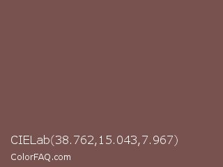 CIELab 38.762,15.043,7.967 Color is a normal red color and the nearest color is Ferra #704f50. Hex code #77524f and RGB value is rgb(119,82,79). In RGB color space, this color is composed of 47% red, 32% green, 31% blue, In CMYK color space, this color is composed of 0% cyan, 31% magenta, 34% yellow , 53% black , In HSL color space, this color has a hue angle of 5° , 20% saturation and 39% lightness.