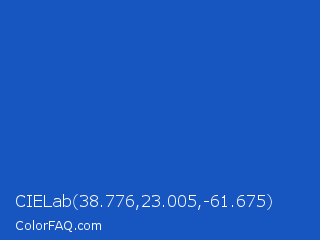 CIELab 38.776,23.005,-61.675 Color is a normal blue color and the nearest color is Sapphire #0f52ba. Hex code #1755c1 and RGB value is rgb(23,85,193). In RGB color space, this color is composed of 9% red, 33% green, 76% blue, In CMYK color space, this color is composed of 88% cyan, 56% magenta, 0% yellow , 24% black , In HSL color space, this color has a hue angle of 218° , 79% saturation and 42% lightness.