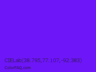 CIELab 38.795,77.107,-92.383 Color is a normal violet color and the nearest color is Electric Indigo #6f00ff. Hex code #6d16f7 and RGB value is rgb(109,22,247). In RGB color space, this color is composed of 43% red, 9% green, 97% blue, In CMYK color space, this color is composed of 56% cyan, 91% magenta, 0% yellow , 3% black , In HSL color space, this color has a hue angle of 263° , 93% saturation and 53% lightness.
