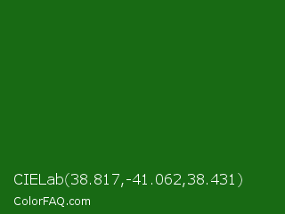 CIELab 38.817,-41.062,38.431 Color is a dark green color and the nearest color is Japanese Laurel #0a6906. Hex code #186a14 and RGB value is rgb(24,106,20). In RGB color space, this color is composed of 9% red, 42% green, 8% blue, In CMYK color space, this color is composed of 77% cyan, 0% magenta, 81% yellow , 58% black , In HSL color space, this color has a hue angle of 117° , 68% saturation and 25% lightness.