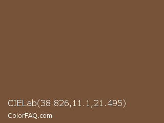 CIELab 38.826,11.1,21.495 Color is a normal orange color and the nearest color is Tuscan Brown Coffee #6f4e37. Hex code #775439 and RGB value is rgb(119,84,57). In RGB color space, this color is composed of 47% red, 33% green, 22% blue, In CMYK color space, this color is composed of 0% cyan, 29% magenta, 52% yellow , 53% black , In HSL color space, this color has a hue angle of 26° , 35% saturation and 35% lightness.