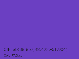 CIELab 38.857,48.422,-61.904 Color is a normal indigo color and the nearest color is Purple Heart Crayola #652dc1. Hex code #6b3fc2 and RGB value is rgb(107,63,194). In RGB color space, this color is composed of 42% red, 25% green, 76% blue, In CMYK color space, this color is composed of 45% cyan, 68% magenta, 0% yellow , 24% black , In HSL color space, this color has a hue angle of 260° , 52% saturation and 50% lightness.