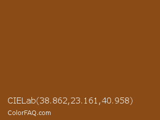 CIELab 38.862,23.161,40.958 Color is a normal orange color and the nearest color is Saddle Brown #8b4513. Hex code #8b4b16 and RGB value is rgb(139,75,22). In RGB color space, this color is composed of 55% red, 29% green, 9% blue, In CMYK color space, this color is composed of 0% cyan, 46% magenta, 84% yellow , 45% black , In HSL color space, this color has a hue angle of 27° , 73% saturation and 32% lightness.