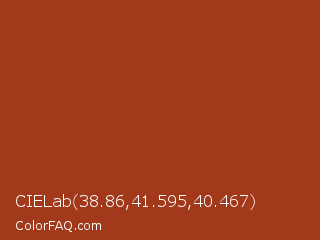 CIELab 38.86,41.595,40.467 Color is a normal red color and the nearest color is Cognac #9f381d. Hex code #a1391a and RGB value is rgb(161,57,26). In RGB color space, this color is composed of 63% red, 22% green, 10% blue, In CMYK color space, this color is composed of 0% cyan, 65% magenta, 84% yellow , 37% black , In HSL color space, this color has a hue angle of 14° , 72% saturation and 37% lightness.