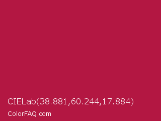 CIELab 38.881,60.244,17.884 Color is a normal rose color and the nearest color is French Wine #ac1e44. Hex code #b31742 and RGB value is rgb(179,23,66). In RGB color space, this color is composed of 70% red, 9% green, 26% blue, In CMYK color space, this color is composed of 0% cyan, 87% magenta, 63% yellow , 30% black , In HSL color space, this color has a hue angle of 343° , 77% saturation and 40% lightness.
