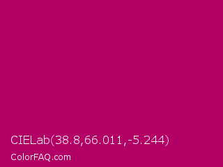 CIELab 38.8,66.011,-5.244 Color is a normal magenta color and the nearest color is Lipstick #ab0563. Hex code #b30066 and RGB value is rgb(179,0,102). In RGB color space, this color is composed of 70% red, 0% green, 40% blue, In CMYK color space, this color is composed of 0% cyan, 100% magenta, 43% yellow , 30% black , In HSL color space, this color has a hue angle of 326° , 100% saturation and 35% lightness.