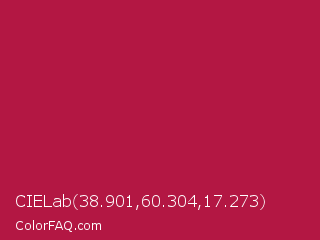 CIELab 38.901,60.304,17.273 Color is a normal rose color and the nearest color is French Wine #ac1e44. Hex code #b31743 and RGB value is rgb(179,23,67). In RGB color space, this color is composed of 70% red, 9% green, 26% blue, In CMYK color space, this color is composed of 0% cyan, 87% magenta, 63% yellow , 30% black , In HSL color space, this color has a hue angle of 343° , 77% saturation and 40% lightness.