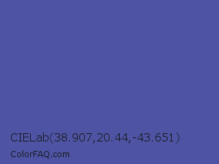 CIELab 38.907,20.44,-43.651 Color is a normal blue color and the nearest color is Liberty #545aa7. Hex code #4e54a3 and RGB value is rgb(78,84,163). In RGB color space, this color is composed of 31% red, 33% green, 64% blue, In CMYK color space, this color is composed of 52% cyan, 48% magenta, 0% yellow , 36% black , In HSL color space, this color has a hue angle of 236° , 35% saturation and 47% lightness.