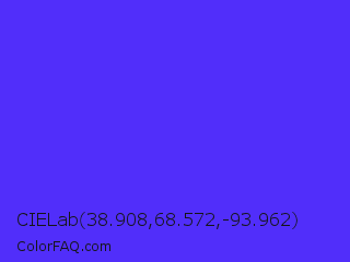 CIELab 38.908,68.572,-93.962 Color is a normal indigo color and the nearest color is Han Purple #5218fa. Hex code #512efa and RGB value is rgb(81,46,250). In RGB color space, this color is composed of 32% red, 18% green, 98% blue, In CMYK color space, this color is composed of 68% cyan, 82% magenta, 0% yellow , 2% black , In HSL color space, this color has a hue angle of 250° , 95% saturation and 58% lightness.