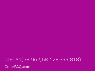 CIELab 38.962,68.128,-33.818 Color is a normal magenta color and the nearest color is Violet Eggplant #991199. Hex code #a80894 and RGB value is rgb(168,8,148). In RGB color space, this color is composed of 66% red, 3% green, 58% blue, In CMYK color space, this color is composed of 0% cyan, 95% magenta, 12% yellow , 34% black , In HSL color space, this color has a hue angle of 308° , 91% saturation and 35% lightness.