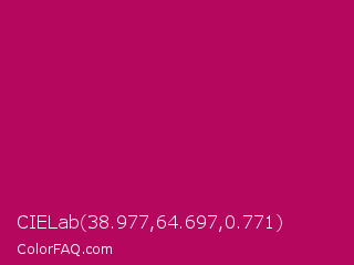 CIELab 38.977,64.697,0.771 Color is a normal rose color and the nearest color is Lipstick #ab0563. Hex code #b4075d and RGB value is rgb(180,7,93). In RGB color space, this color is composed of 71% red, 3% green, 36% blue, In CMYK color space, this color is composed of 0% cyan, 96% magenta, 48% yellow , 29% black , In HSL color space, this color has a hue angle of 330° , 93% saturation and 37% lightness.