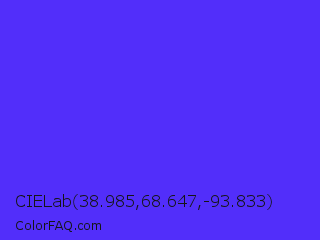 CIELab 38.985,68.647,-93.833 Color is a normal indigo color and the nearest color is Han Purple #5218fa. Hex code #522efa and RGB value is rgb(82,46,250). In RGB color space, this color is composed of 32% red, 18% green, 98% blue, In CMYK color space, this color is composed of 67% cyan, 82% magenta, 0% yellow , 2% black , In HSL color space, this color has a hue angle of 251° , 95% saturation and 58% lightness.