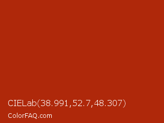 CIELab 38.991,52.7,48.307 Color is a normal red color and the nearest color is Rufous #a81c07. Hex code #af280a and RGB value is rgb(175,40,10). In RGB color space, this color is composed of 69% red, 16% green, 4% blue, In CMYK color space, this color is composed of 0% cyan, 77% magenta, 94% yellow , 31% black , In HSL color space, this color has a hue angle of 11° , 89% saturation and 36% lightness.