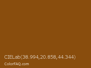 CIELab 38.994,20.858,44.344 Color is a dark orange color and the nearest color is Korma #8f4b0e. Hex code #894d0d and RGB value is rgb(137,77,13). In RGB color space, this color is composed of 54% red, 30% green, 5% blue, In CMYK color space, this color is composed of 0% cyan, 44% magenta, 91% yellow , 46% black , In HSL color space, this color has a hue angle of 31° , 83% saturation and 29% lightness.