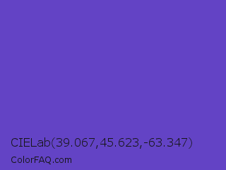 CIELab 39.067,45.623,-63.347 Color is a normal indigo color and the nearest color is Iris #5a4fcf. Hex code #6343c5 and RGB value is rgb(99,67,197). In RGB color space, this color is composed of 39% red, 26% green, 77% blue, In CMYK color space, this color is composed of 50% cyan, 66% magenta, 0% yellow , 23% black , In HSL color space, this color has a hue angle of 255° , 53% saturation and 52% lightness.