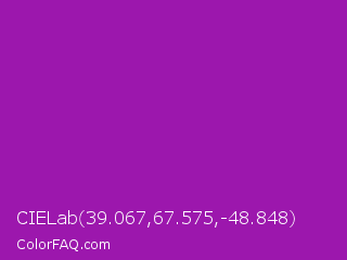 CIELab 39.067,67.575,-48.848 Color is a normal magenta color and the nearest color is Violet Eggplant #991199. Hex code #9c17ad and RGB value is rgb(156,23,173). In RGB color space, this color is composed of 61% red, 9% green, 68% blue, In CMYK color space, this color is composed of 10% cyan, 87% magenta, 0% yellow , 32% black , In HSL color space, this color has a hue angle of 293° , 77% saturation and 38% lightness.