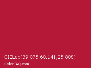CIELab 39.075,60.141,25.808 Color is a normal red color and the nearest color is Shiraz #b20931. Hex code #b51736 and RGB value is rgb(181,23,54). In RGB color space, this color is composed of 71% red, 9% green, 21% blue, In CMYK color space, this color is composed of 0% cyan, 87% magenta, 70% yellow , 29% black , In HSL color space, this color has a hue angle of 348° , 77% saturation and 40% lightness.
