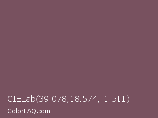 CIELab 39.078,18.574,-1.511 Color is a normal rose color and the nearest color is Russett #755a57. Hex code #78515f and RGB value is rgb(120,81,95). In RGB color space, this color is composed of 47% red, 32% green, 37% blue, In CMYK color space, this color is composed of 0% cyan, 33% magenta, 21% yellow , 53% black , In HSL color space, this color has a hue angle of 338° , 19% saturation and 39% lightness.