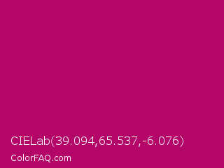 CIELab 39.094,65.537,-6.076 Color is a normal magenta color and the nearest color is Lipstick #ab0563. Hex code #b30668 and RGB value is rgb(179,6,104). In RGB color space, this color is composed of 70% red, 2% green, 41% blue, In CMYK color space, this color is composed of 0% cyan, 97% magenta, 42% yellow , 30% black , In HSL color space, this color has a hue angle of 326° , 94% saturation and 36% lightness.