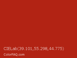 CIELab 39.101,55.298,44.775 Color is a normal red color and the nearest color is Carnelian #b31b1b. Hex code #b22314 and RGB value is rgb(178,35,20). In RGB color space, this color is composed of 70% red, 14% green, 8% blue, In CMYK color space, this color is composed of 0% cyan, 80% magenta, 89% yellow , 30% black , In HSL color space, this color has a hue angle of 6° , 80% saturation and 39% lightness.