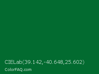CIELab 39.142,-40.648,25.602 Color is a very dark green color and the nearest color is Fun Green #016d39. Hex code #026b30 and RGB value is rgb(2,107,48). In RGB color space, this color is composed of 1% red, 42% green, 19% blue, In CMYK color space, this color is composed of 98% cyan, 0% magenta, 55% yellow , 58% black , In HSL color space, this color has a hue angle of 146° , 96% saturation and 21% lightness.
