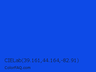 CIELab 39.161,44.164,-82.91 Color is a normal blue color and the nearest color is Blue RYB #0247fe. Hex code #0d4ae7 and RGB value is rgb(13,74,231). In RGB color space, this color is composed of 5% red, 29% green, 91% blue, In CMYK color space, this color is composed of 94% cyan, 68% magenta, 0% yellow , 9% black , In HSL color space, this color has a hue angle of 223° , 89% saturation and 48% lightness.