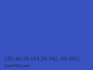CIELab 39.164,28.342,-60.992 Color is a normal blue color and the nearest color is Cerulean Blue #2a52be. Hex code #3952c1 and RGB value is rgb(57,82,193). In RGB color space, this color is composed of 22% red, 32% green, 76% blue, In CMYK color space, this color is composed of 70% cyan, 58% magenta, 0% yellow , 24% black , In HSL color space, this color has a hue angle of 229° , 54% saturation and 49% lightness.