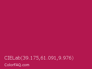 CIELab 39.175,61.091,9.976 Color is a normal rose color and the nearest color is French Wine #ac1e44. Hex code #b3174f and RGB value is rgb(179,23,79). In RGB color space, this color is composed of 70% red, 9% green, 31% blue, In CMYK color space, this color is composed of 0% cyan, 87% magenta, 56% yellow , 30% black , In HSL color space, this color has a hue angle of 338° , 77% saturation and 40% lightness.