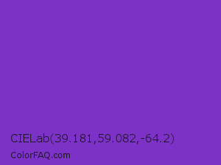 CIELab 39.181,59.082,-64.2 Color is a normal violet color and the nearest color is Purple Heart Crayola #652dc1. Hex code #7d32c7 and RGB value is rgb(125,50,199). In RGB color space, this color is composed of 49% red, 20% green, 78% blue, In CMYK color space, this color is composed of 37% cyan, 75% magenta, 0% yellow , 22% black , In HSL color space, this color has a hue angle of 270° , 60% saturation and 49% lightness.