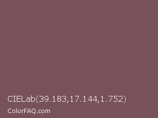 CIELab 39.183,17.144,1.752 Color is a normal red color and the nearest color is Russett #755a57. Hex code #78525a and RGB value is rgb(120,82,90). In RGB color space, this color is composed of 47% red, 32% green, 35% blue, In CMYK color space, this color is composed of 0% cyan, 32% magenta, 25% yellow , 53% black , In HSL color space, this color has a hue angle of 347° , 19% saturation and 40% lightness.