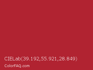 CIELab 39.192,55.921,28.849 Color is a normal red color and the nearest color is Upsdell Red #ae2029. Hex code #b12331 and RGB value is rgb(177,35,49). In RGB color space, this color is composed of 69% red, 14% green, 19% blue, In CMYK color space, this color is composed of 0% cyan, 80% magenta, 72% yellow , 31% black , In HSL color space, this color has a hue angle of 354° , 67% saturation and 42% lightness.
