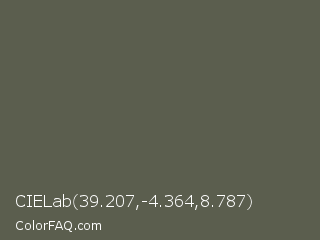 CIELab 39.207,-4.364,8.787 Color is a normal lime color and the nearest color is Ebony #555d50. Hex code #5b5e4e and RGB value is rgb(91,94,78). In RGB color space, this color is composed of 36% red, 37% green, 31% blue, In CMYK color space, this color is composed of 3% cyan, 0% magenta, 17% yellow , 63% black , In HSL color space, this color has a hue angle of 71° , 9% saturation and 34% lightness.