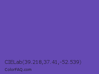 CIELab 39.218,37.41,-52.539 Color is a normal indigo color and the nearest color is Studio #714ab2. Hex code #6549b3 and RGB value is rgb(101,73,179). In RGB color space, this color is composed of 40% red, 29% green, 70% blue, In CMYK color space, this color is composed of 44% cyan, 59% magenta, 0% yellow , 30% black , In HSL color space, this color has a hue angle of 256° , 42% saturation and 49% lightness.