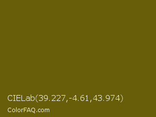 CIELab 39.227,-4.61,43.974 Color is a very dark yellow color and the nearest color is Spicy Mustard #74640d. Hex code #685d09 and RGB value is rgb(104,93,9). In RGB color space, this color is composed of 41% red, 36% green, 4% blue, In CMYK color space, this color is composed of 0% cyan, 11% magenta, 91% yellow , 59% black , In HSL color space, this color has a hue angle of 53° , 84% saturation and 22% lightness.