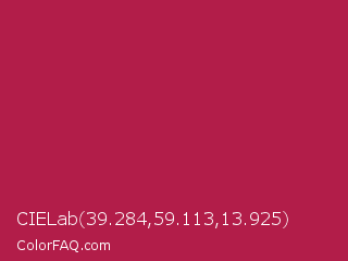 CIELab 39.284,59.113,13.925 Color is a normal rose color and the nearest color is French Wine #ac1e44. Hex code #b21d49 and RGB value is rgb(178,29,73). In RGB color space, this color is composed of 70% red, 11% green, 29% blue, In CMYK color space, this color is composed of 0% cyan, 84% magenta, 59% yellow , 30% black , In HSL color space, this color has a hue angle of 342° , 72% saturation and 41% lightness.