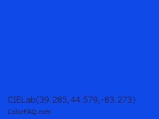 CIELab 39.285,44.579,-83.273 Color is a normal blue color and the nearest color is Blue RYB #0247fe. Hex code #0f4ae8 and RGB value is rgb(15,74,232). In RGB color space, this color is composed of 6% red, 29% green, 91% blue, In CMYK color space, this color is composed of 94% cyan, 68% magenta, 0% yellow , 9% black , In HSL color space, this color has a hue angle of 224° , 88% saturation and 48% lightness.