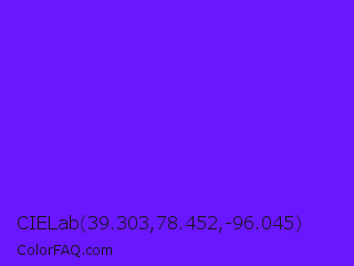 CIELab 39.303,78.452,-96.045 Color is a normal violet color and the nearest color is Han Purple #5218fa. Hex code #6917ff and RGB value is rgb(105,23,255). In RGB color space, this color is composed of 41% red, 9% green, 100% blue, In CMYK color space, this color is composed of 59% cyan, 91% magenta, 0% yellow , 0% black , In HSL color space, this color has a hue angle of 261° , 100% saturation and 55% lightness.