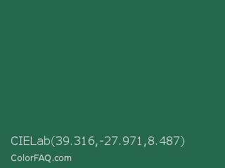 CIELab 39.316,-27.971,8.487 Color is a dark green color and the nearest color is Green Pea #1d6142. Hex code #25684e and RGB value is rgb(37,104,78). In RGB color space, this color is composed of 15% red, 41% green, 31% blue, In CMYK color space, this color is composed of 64% cyan, 0% magenta, 25% yellow , 59% black , In HSL color space, this color has a hue angle of 157° , 48% saturation and 28% lightness.